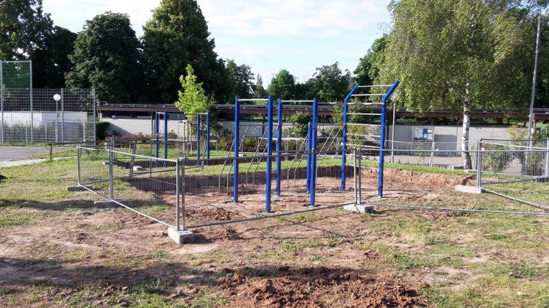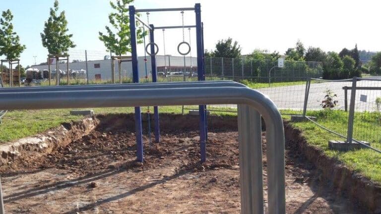 Direkt angrenzend wurde der Standort um eine moderne Calisthenics-Anlage ergänzt. Diese bietet robuste Outdoor-Trainingsmodule wie Klimmzugstangen, Sprossen- und Hangelemente und ermöglicht ein effektives Ganzkörpertraining mit dem eigenen Körpergewicht.