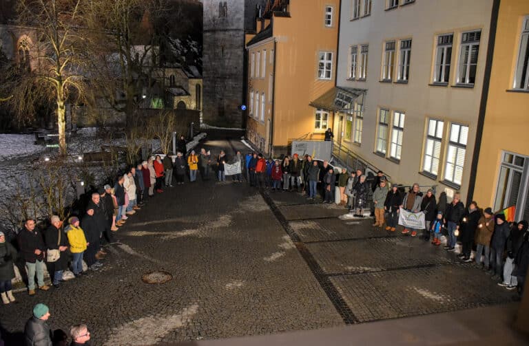 Ein starkes Zeichen für Zusammenhalt, Demokratie und gegen jede Form von Hass und Gewalt setzten am Mittwochabend, 28. Januar 2026, zahlreiche Bürgerinnen und Bürger im Forstamtsgarten vor dem Rathaus in Feuchtwangen. Unter dem Motto "Rathäuser schützen durch Menschenkette" hatte der Stadtrat Feuchtwangen zu einer öffentlichen Solidaritätsbekundung eingeladen – und viele folgten diesem Aufruf.