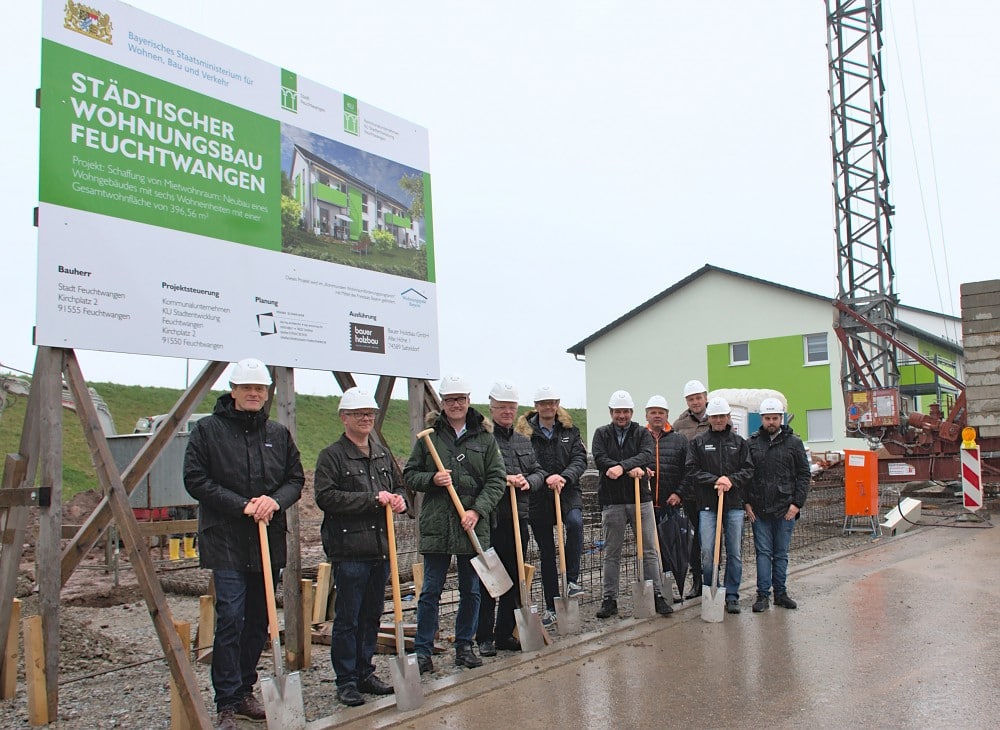 Startschuss für ein neues städtisches Wohngebäude in Feuchtwangen: mit dem symbolischen ersten Spatenstich läuteten die Beteiligten nun offiziell den Baubeginn für ein weiteres Mehrfamilienhaus der Stadt Feuchtwangen im Baugebiet „Röschenhof“ ein.