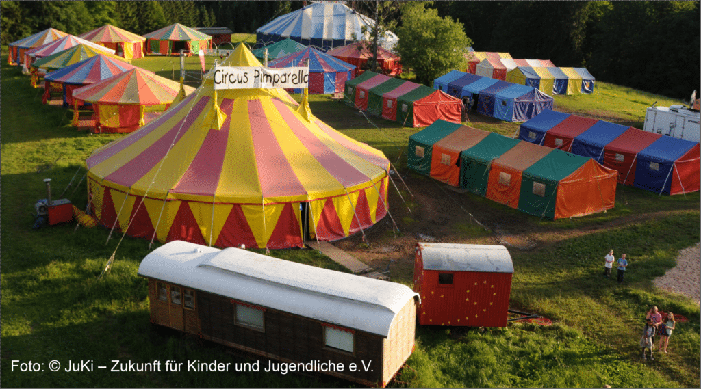 Vielseitiges Circus-Training mit Vollverpflegung: Circusdorf mit umfassender Infrastruktur (Tiere, Wald, Bach, Feuerstelle, Fußball-, Volleyball-, Basketballfeld, Pool, Trampolin, Kletterwand, Circushaus, Trainingshalle und Gruppenzelte, …)